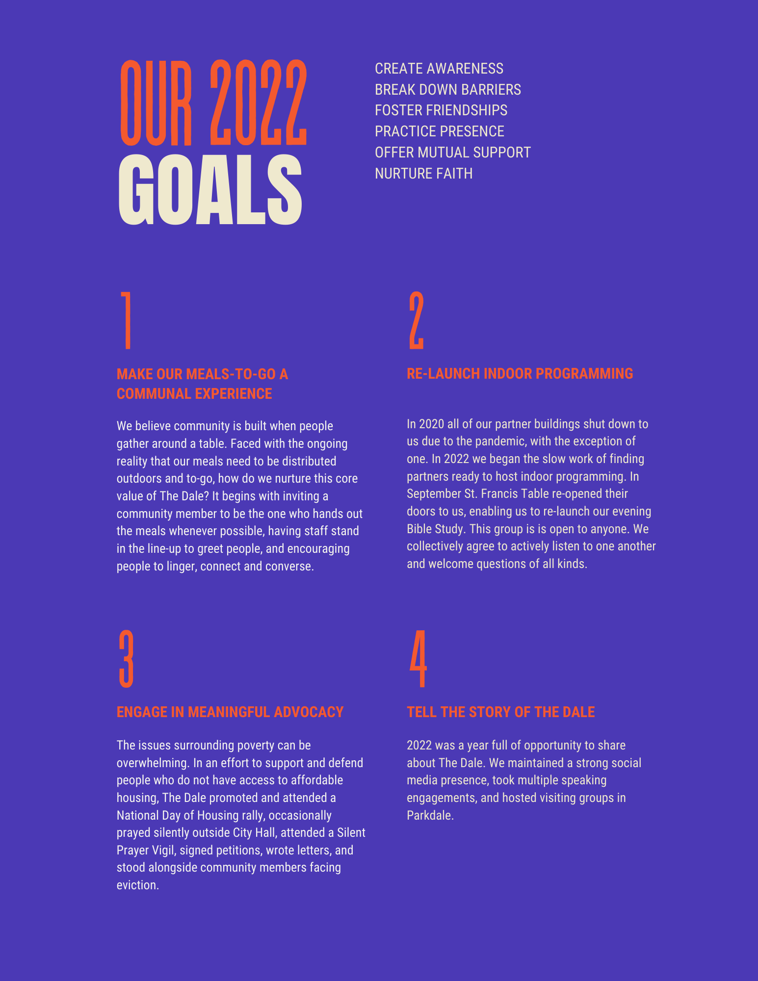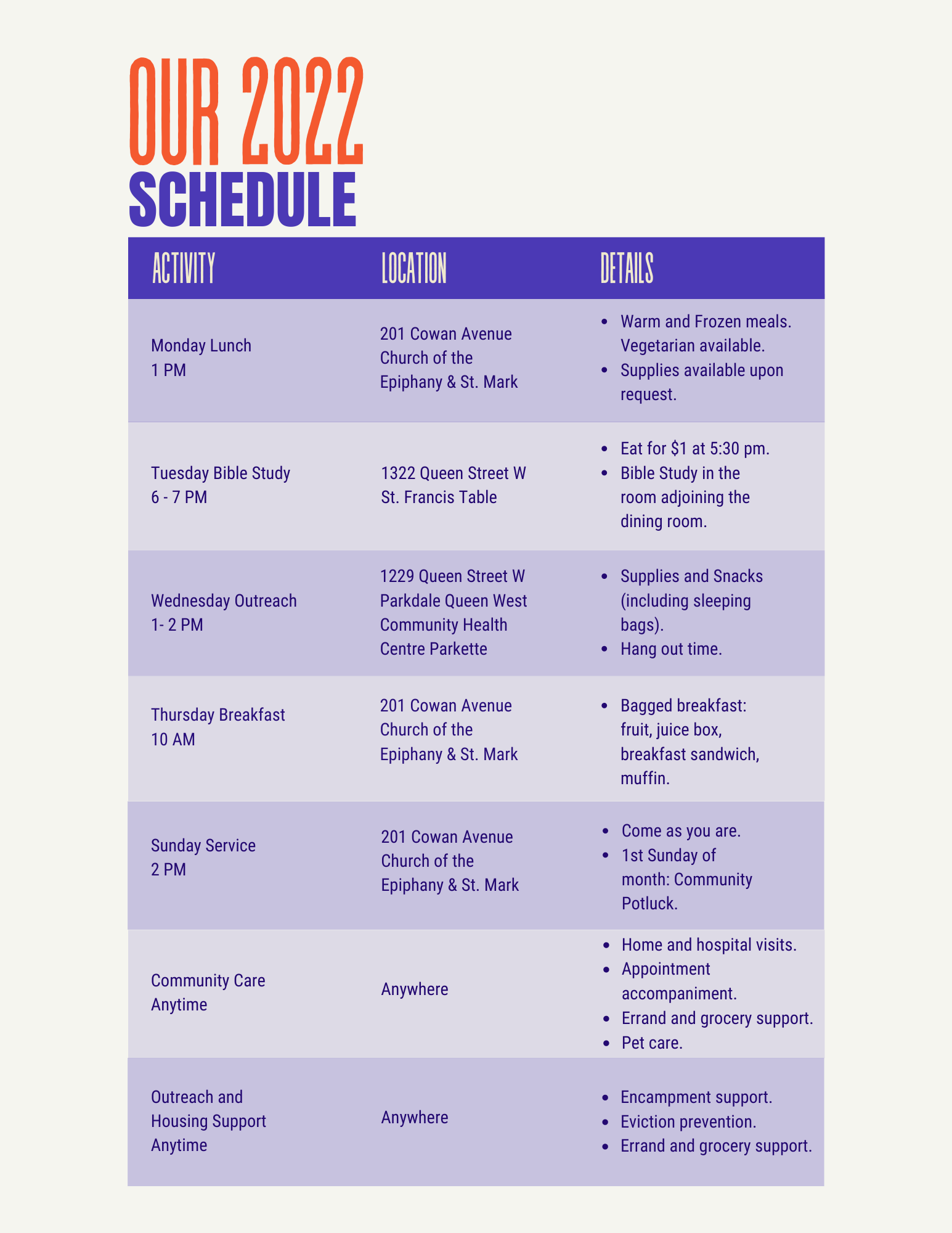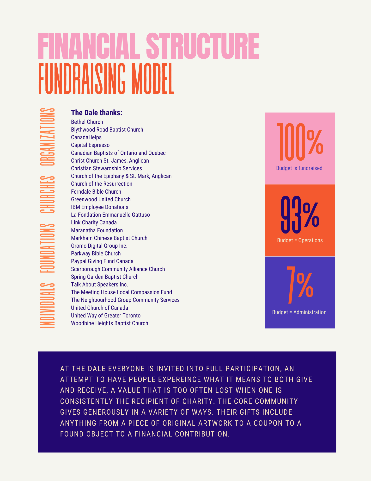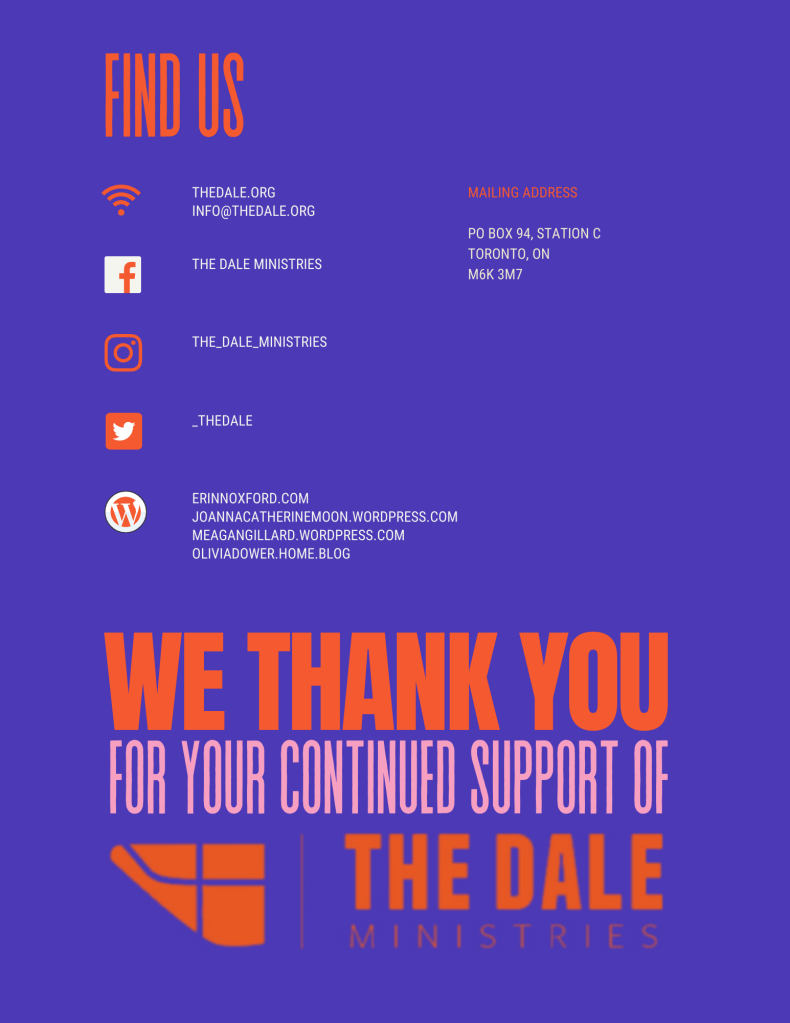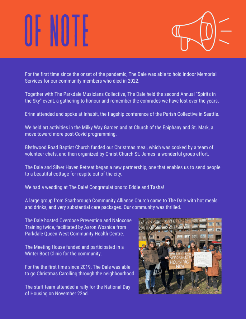 I find that it always helpful to reflect on the previous year and all that it held. Sometimes this is sobering, for instance the number of people who are on the waiting list for Toronto Community Housing increased yet again to a staggering number: 80,532. What is encouraging is how The Dale continues even when the issues are so difficult. I hope that by reading this report you have a deeper understanding of who we are, and that you too find it encouraging.