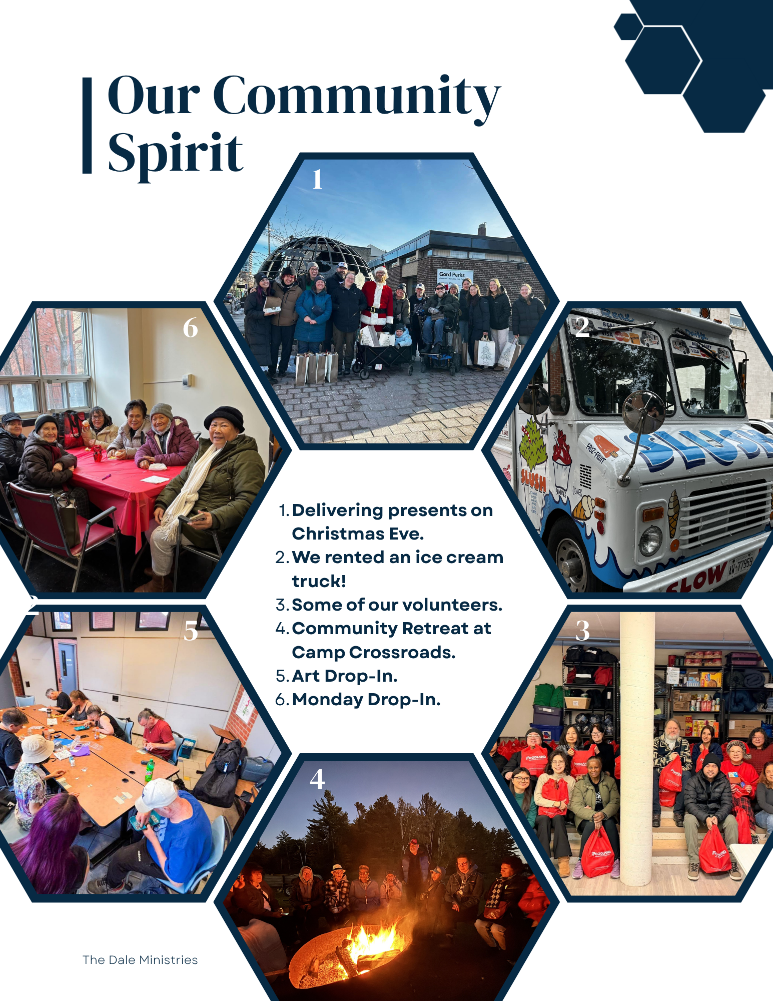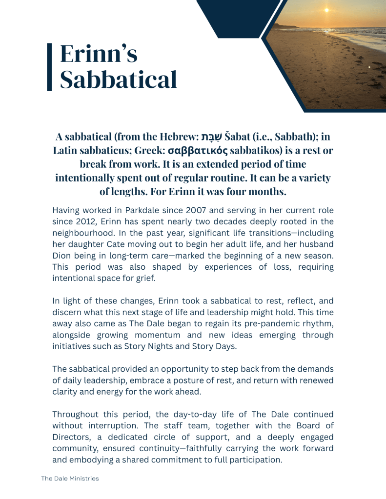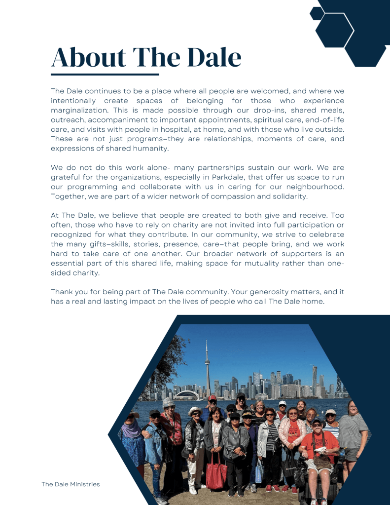 At The Dale, we begin with belonging. We believe that everyone needs a place to be seen, known, and welcomed. In a world where many are pushed to the margins, we work to cultivate a community where each person is valued and invited to participate fully in shared life. What follows is more than a report on programs; it is a story of lives woven together, of gifts shared freely, and of community shaped by compassion, grace, and faith. This was our 2025.